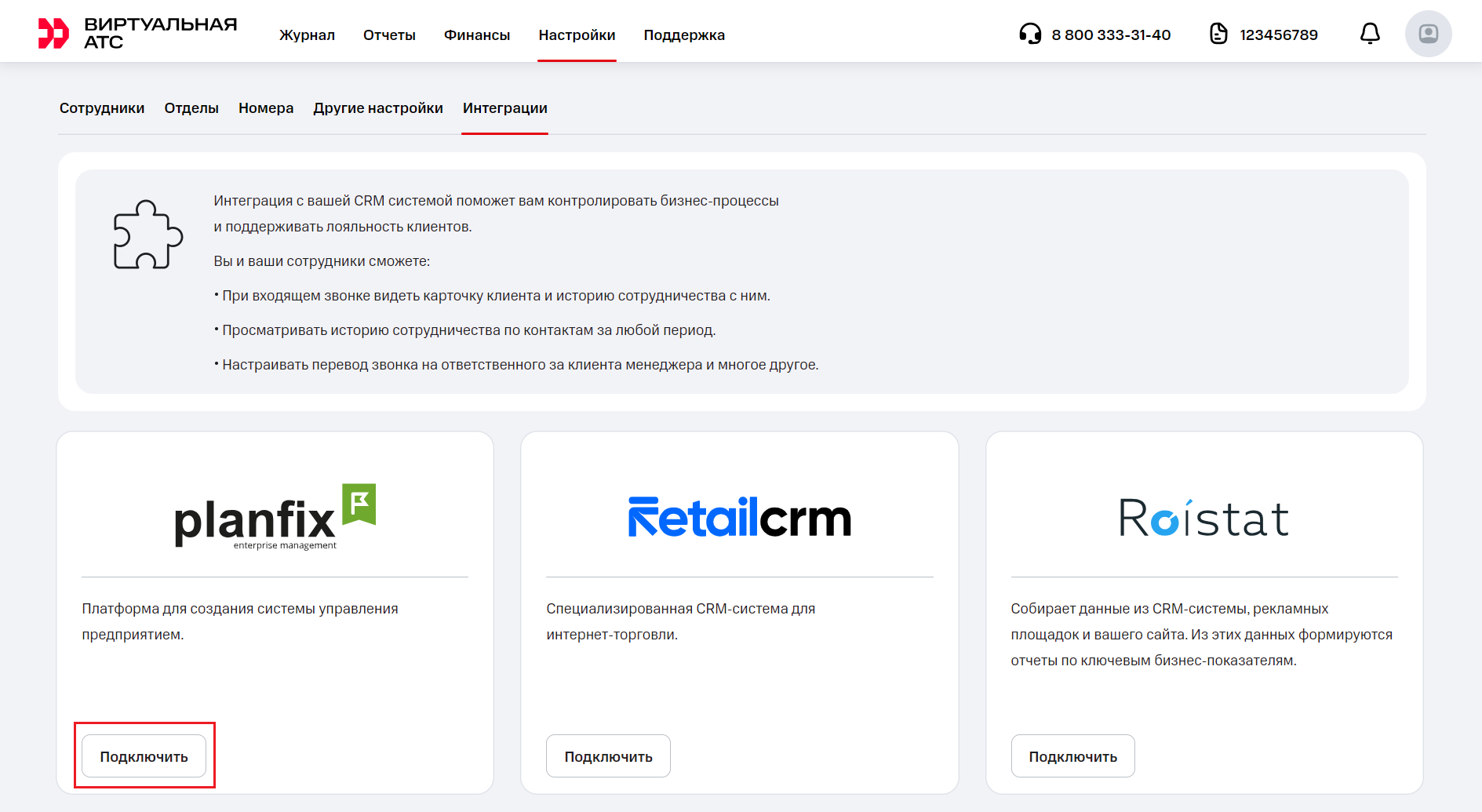 Скопируйте токен телефонии и перейдите в ВАТС. В разделе «Настройки» в правом верхнем углу выберите «Интеграция с CRM». В списке CRM-систем найдите ПланФикс и нажмите «Подключить».