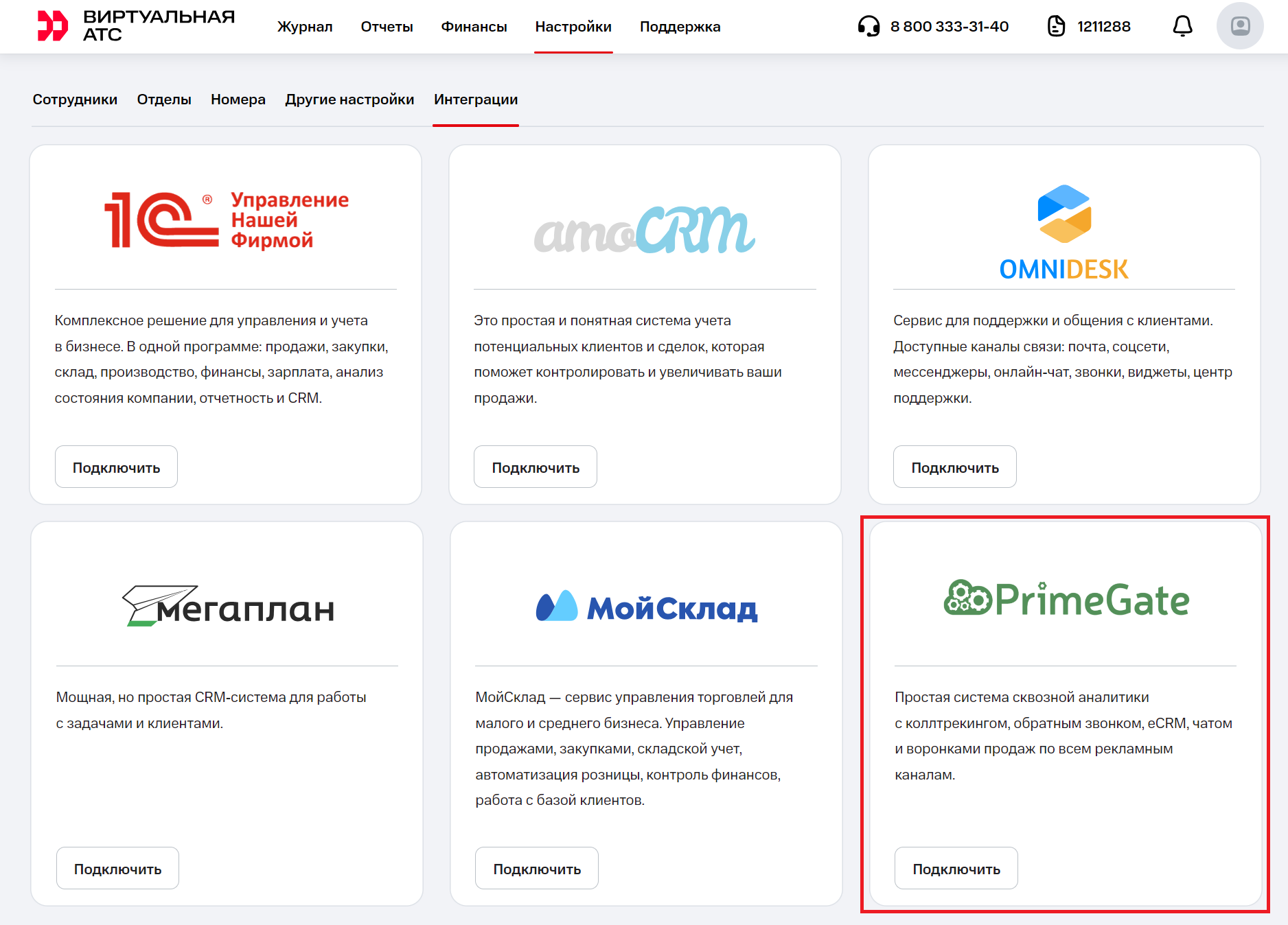 1. Зайдите в раздел «Интеграция с CRM» в Виртуальной АТС и нажмите «Подключить» у карточки PrimeGate.