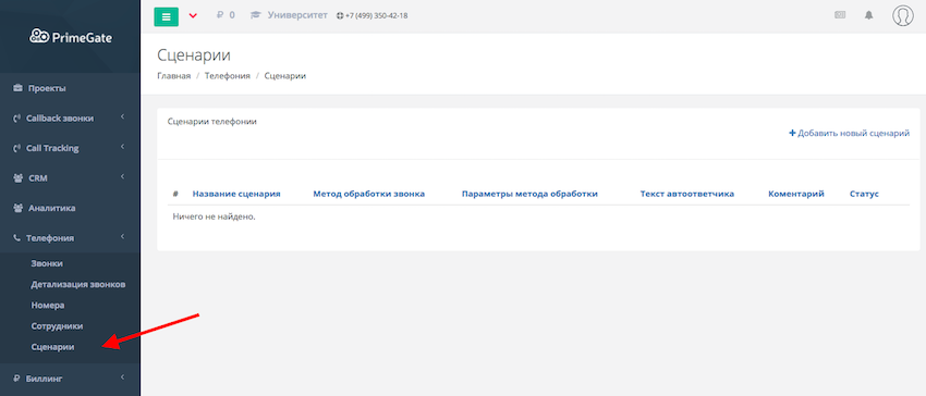 5. В интерфейсе PrimeGate зайдите в раздел «Телефония» → «Сценарии».