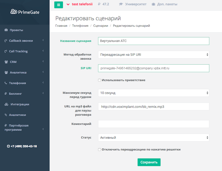 7. В разделе «Телефония» → «Номера» назначьте номеру PrimeGate добавленный сценарий.
