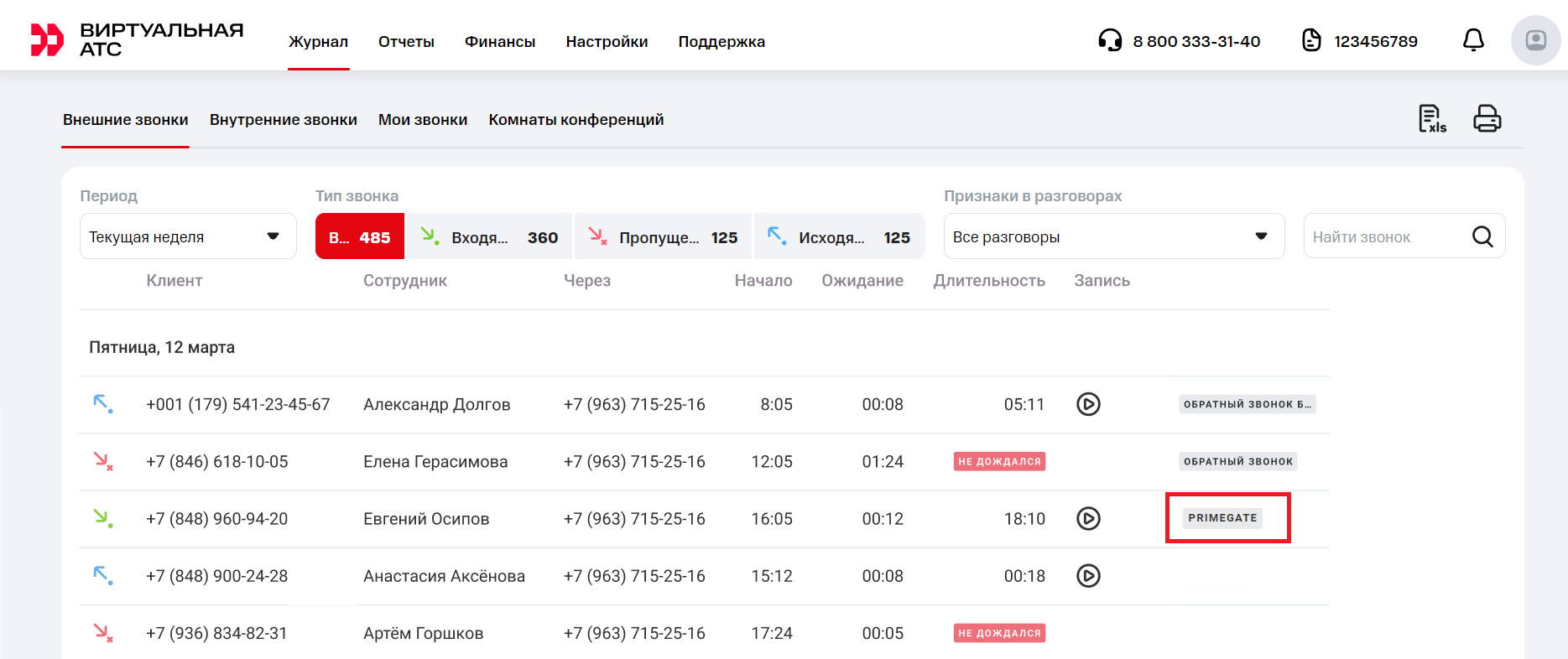 Теперь вы можете принимать звонки из PrimeGate в вашей Виртуальной АТС. В Журнале звонки, поступившие из PrimeGate, будут отмечены специальным символом.