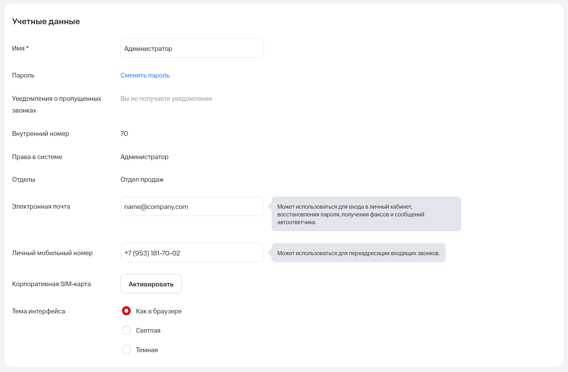 В блоке «Учетные данные» указаны ваш внутренний номер, уровень прав в системе и то, как у вас настроены уведомления о пропущенных звонках. А кроме того, здесь можно: