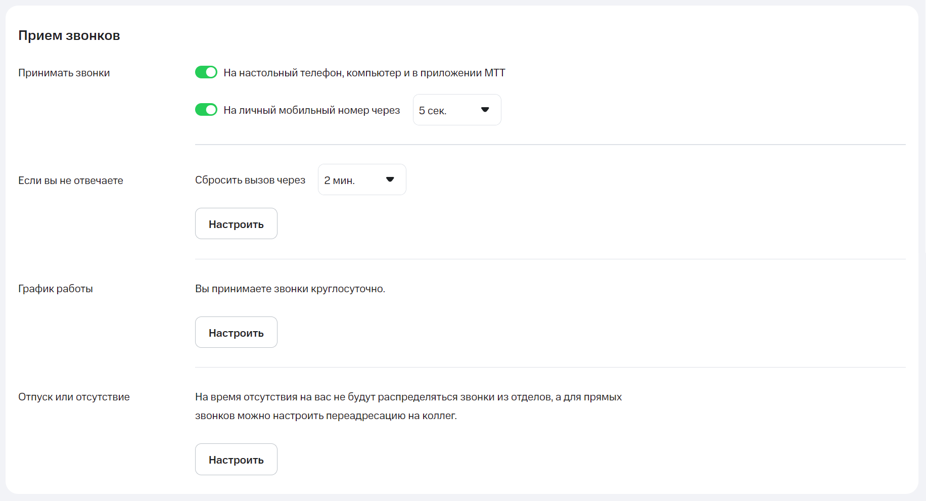 В блоке «Прием звонков» можно настроить важные критерии работы сотрудника, а именно: