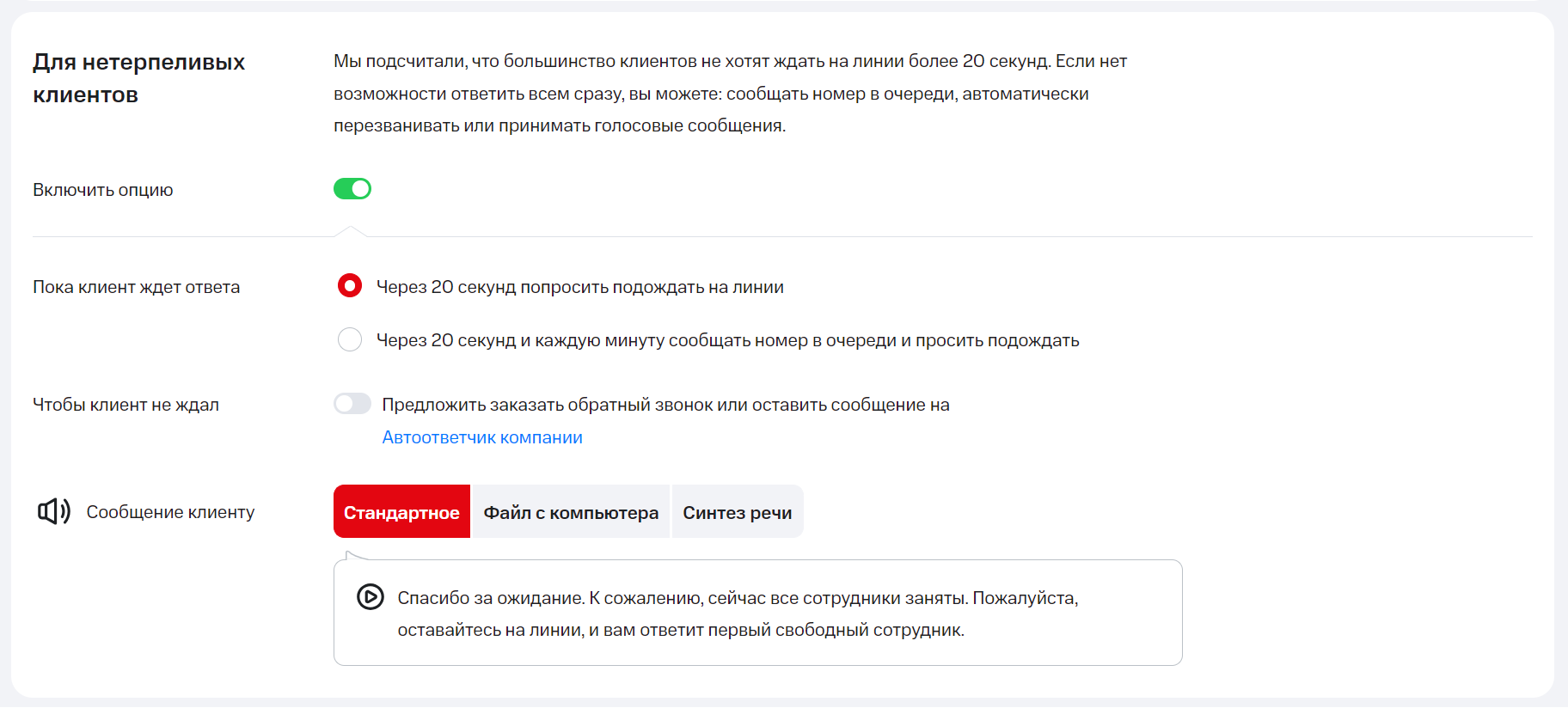 Обратите внимание, что обратный звонок имеет ограничение по времени, такое же, как указано в разделе «Если никто из сотрудников не отвечает в течение…». Подробнее про настройки времени ожидания читайте в статье Гибкая настройка времени ожидания. В случае если истекло время ожидания в очереди и ни один из сотрудников не ответил на звонок, система перезвонит клиенту, извинится и предложит оставить сообщение на автоответчик.
