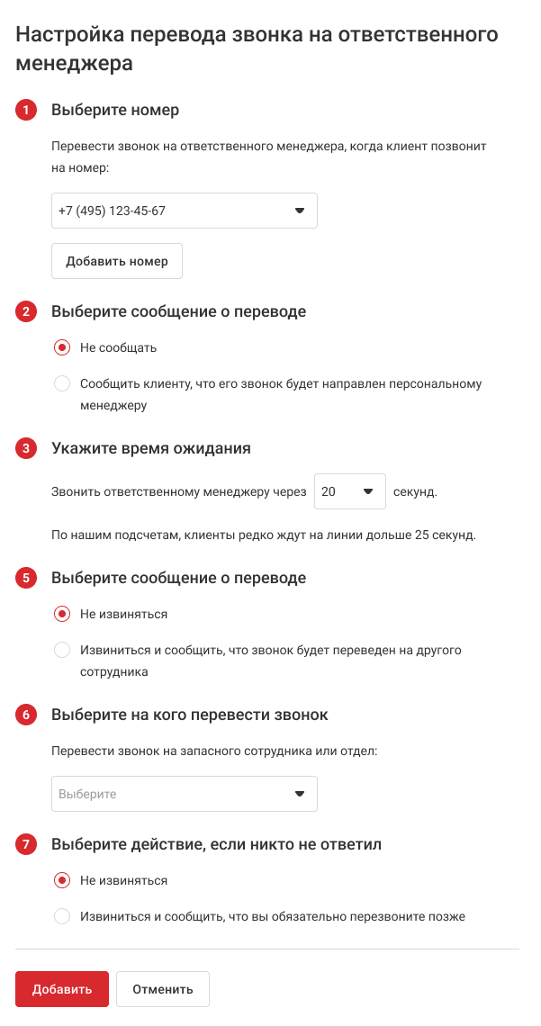 По умолчанию при переадресации АТС озвучивает клиенту стандартное уведомление об отсутствии менеджера и о том, что ему ответит другой специалист. Но вы можете загрузить или создать собственное уведомление, в котором, например, расскажете, куда именно будет перенаправлен звонок. Это подготовит клиента к тому, что ему ответит не тот сотрудник, с которым он планировал поговорить.