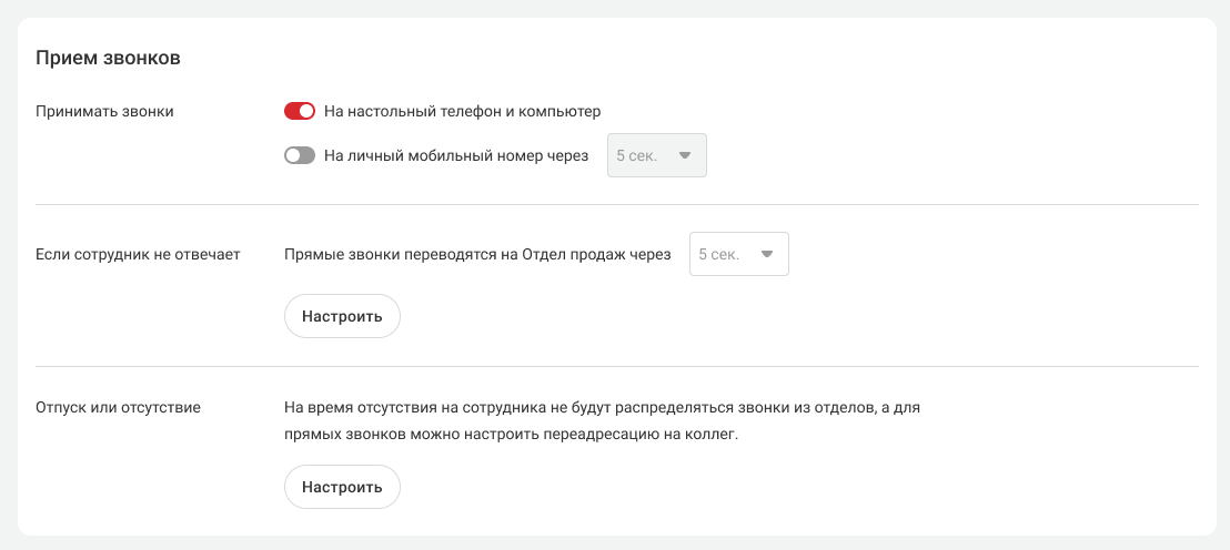2. В настройках профиля сотрудника пролистайте вниз до раздела «Прием звонков». Найдите в нем блок «Если сотрудник не отвечает».