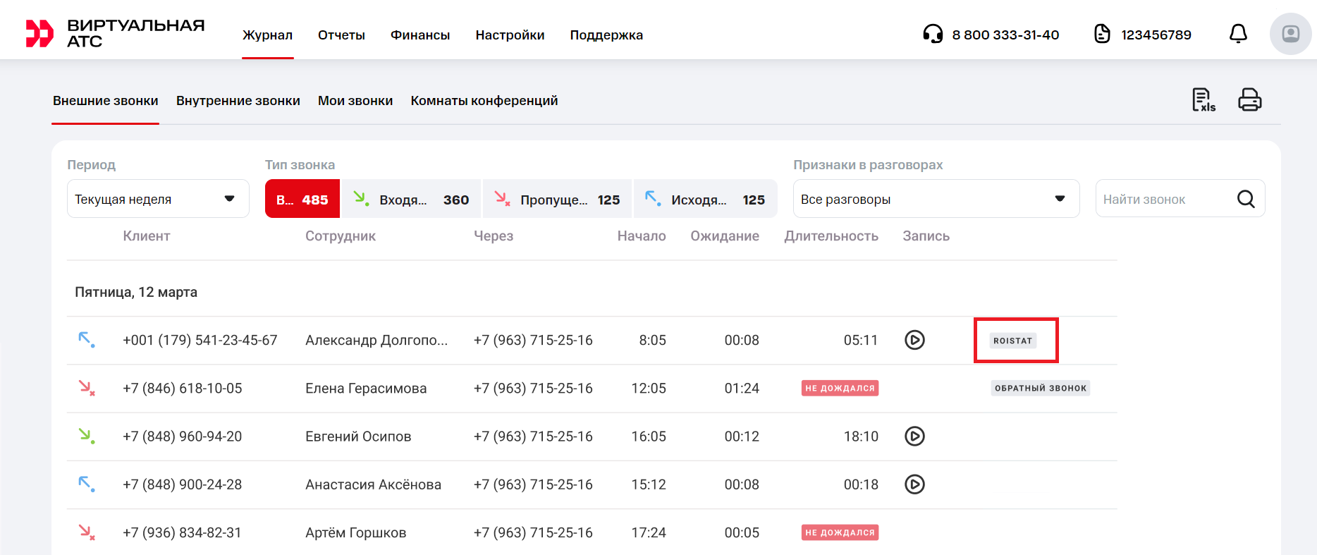 В Журнале и Отчетах Виртуальной АТС звонки с номеров Roistat будут отображаться с пометкой-логотипом Roistat и подсказкой «Звонок из Roistat».