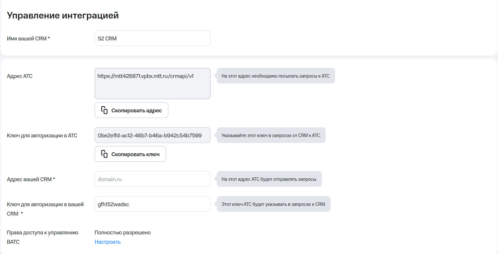 * Ключ для авторизации в АТС — его необходимо скопировать и вставить в S2.