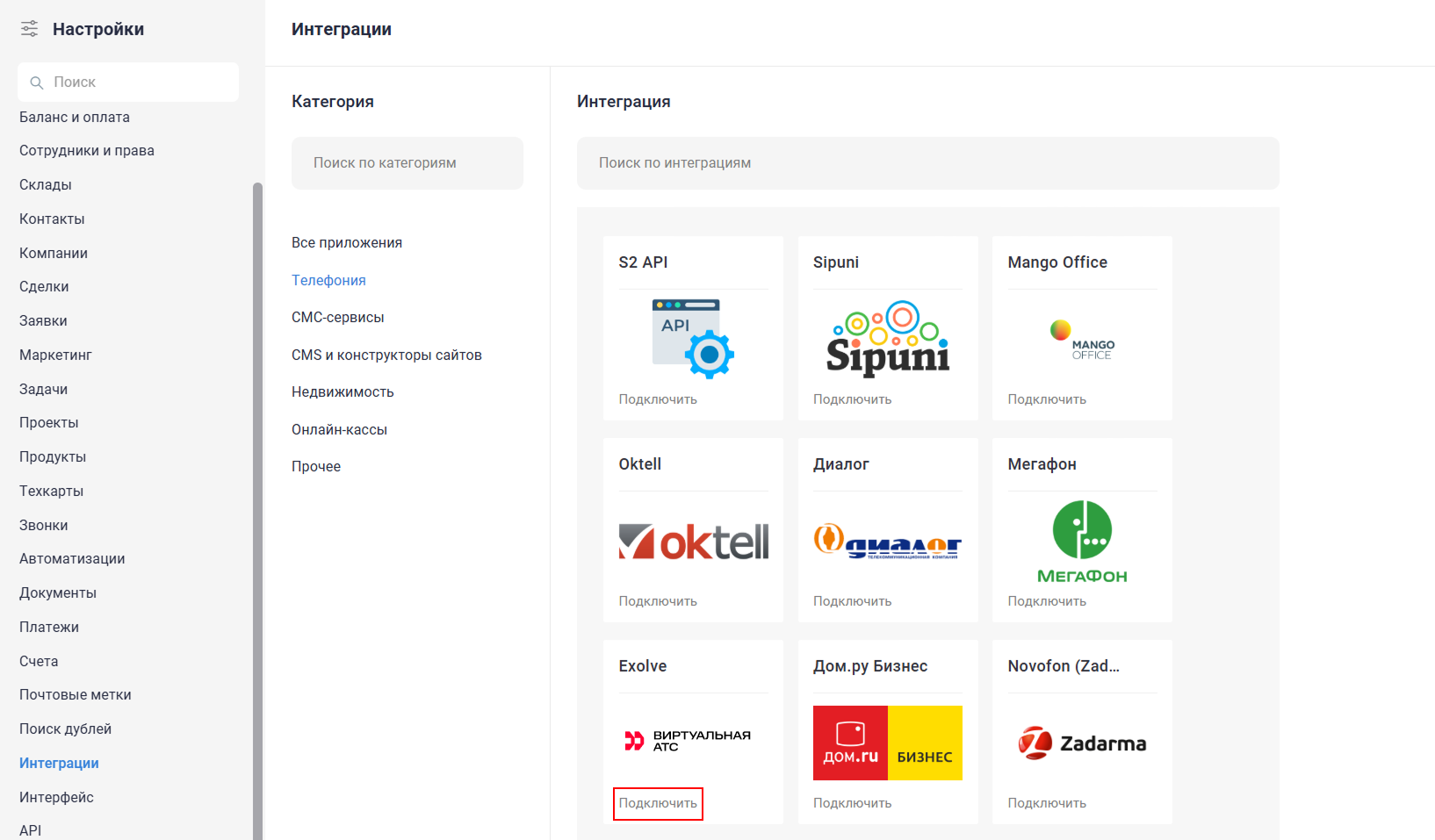 3. В интерфейс с S2 CRM в правом верхнем углу экрана щелкните шестеренку с настройками и перейдите в раздел «Интеграции». Нажмите на категорию «Телефония» и из списка предложенных операторов выберите Exolve.
