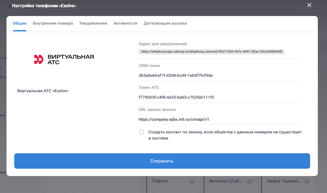 4. В открывшейся форме настройки скопируйте данные в соответствующие поля для АТС.