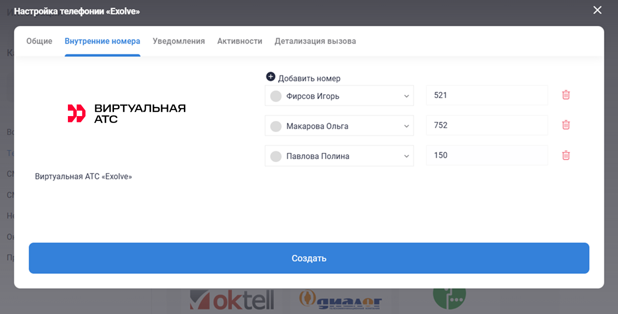5. Телефония может работать с одним внутренним номером, прописанным в настройках интеграции. Но для корректной записи и отражения звонков, необходимо прописать в настройках интеграции на стороне CRM все короткие номера, которые есть в личном кабинете телефонии.