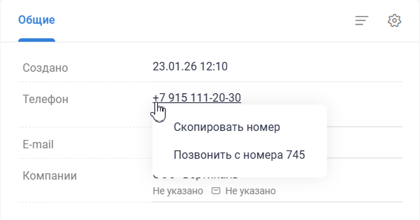 Чтобы сотрудник мог принимать и совершать звонки с компьютера, установите и настройте в системе софтфон. Когда потребуется позвонить клиенту, нажмите в карточке контакта S2 CRM на номер — кнопку «Позвонить с номера».