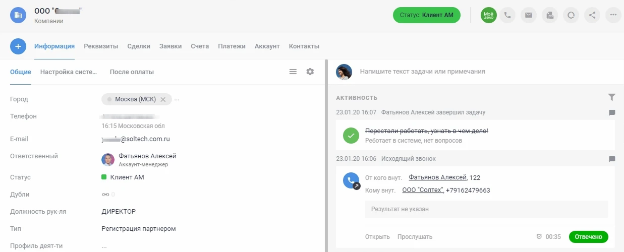 Весь процесс фиксируется. Как только звонок завершится, АТС Exolve отправит данные о нем в вашу CRM. В карточке контакта сразу появится новая запись с информацией об этом разговоре. Все происходит автоматически, вам не нужно ничего записывать или переносить вручную.