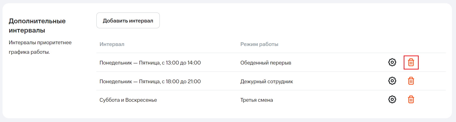 2. Нажмите «Настроить расписание». В блоке «Дополнительные интервалы» найдите режим, который хотите удалить (в нашем примере – «Третья смена»), и нажмите на «корзину» справа.