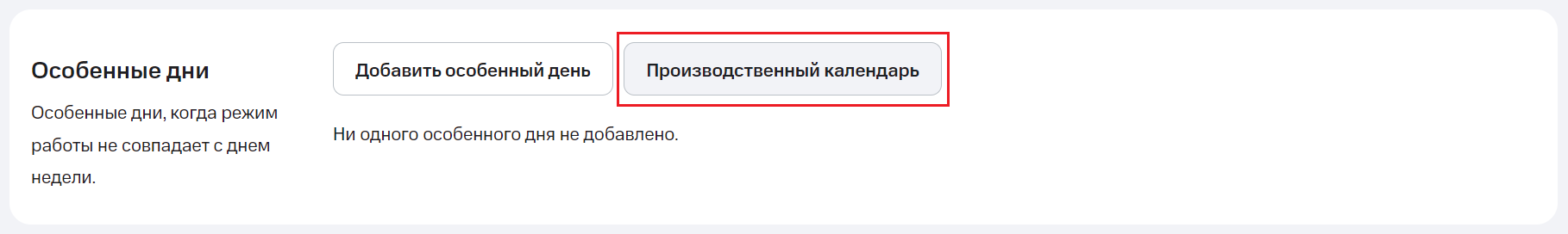 1. В настройках расписания номера перейдите к разделу «Особенные дни» и нажмите на кнопку «Производственный календарь».