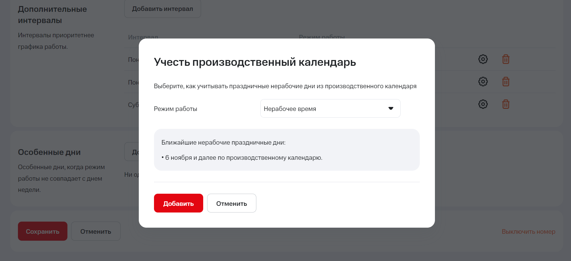 Обратите внимание: если в праздничные дни звонки на номер будет принимать дежурный сотрудник, при настройке производственного календаря в режиме работы выберите вариант «Дежурный сотрудник» и настройте прием звонков.