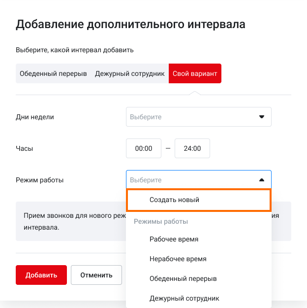 Если работа в вашей компании организована сложнее и для создания корректного расписания вам недостаточно указать время обеденного перерыва и дежурства, вы можете создать собственный дополнительный интервал и настроить для него правила обработки входящих. Своих дополнительных интервалов может быть сколько угодно.