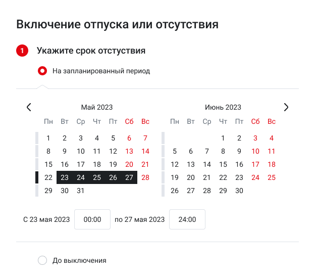 • На запланированный период – если точно знаете, сколько дней сотрудник будет отсутствовать (например, когда сотрудник в отпуске).