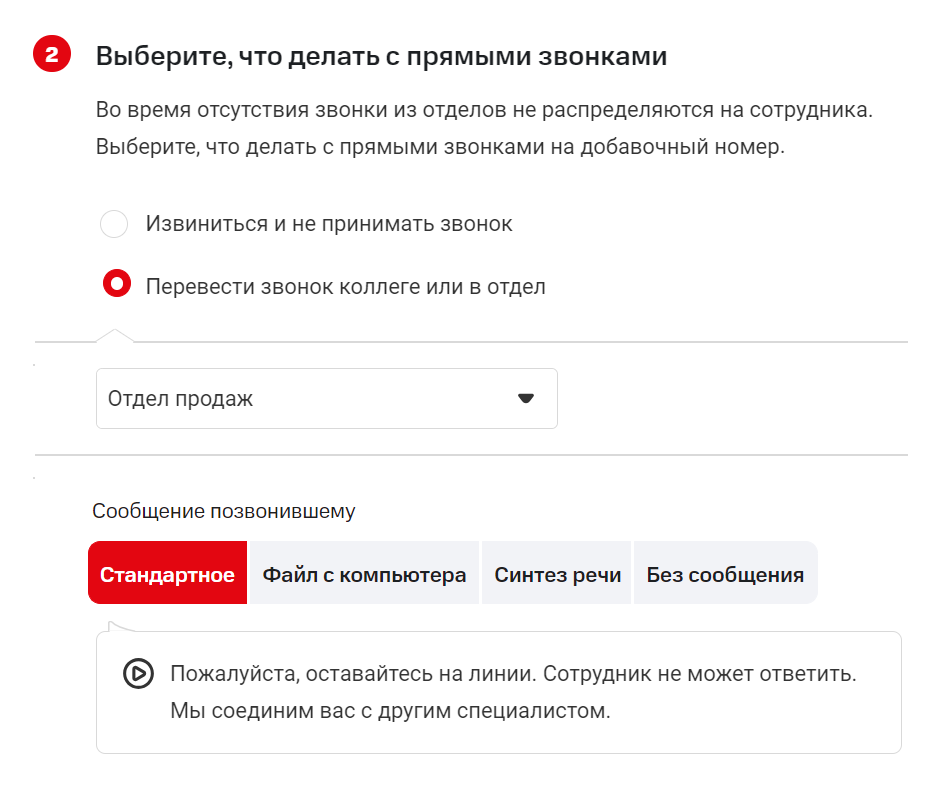 4. Выберите, как должны распределяться звонки во время отсутствия сотрудника. ВАТС может:
