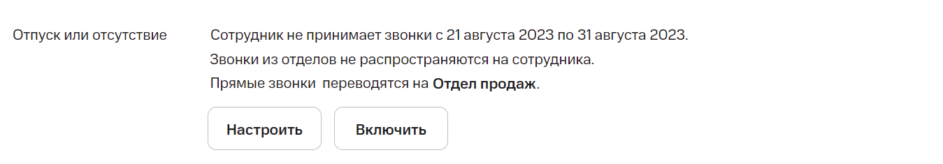 Отпуск или больничный сотрудника – не повод терять прямые звонки на его номер. Теперь можно за пару кликов настроить период отсутствия менеджера, и тогда: