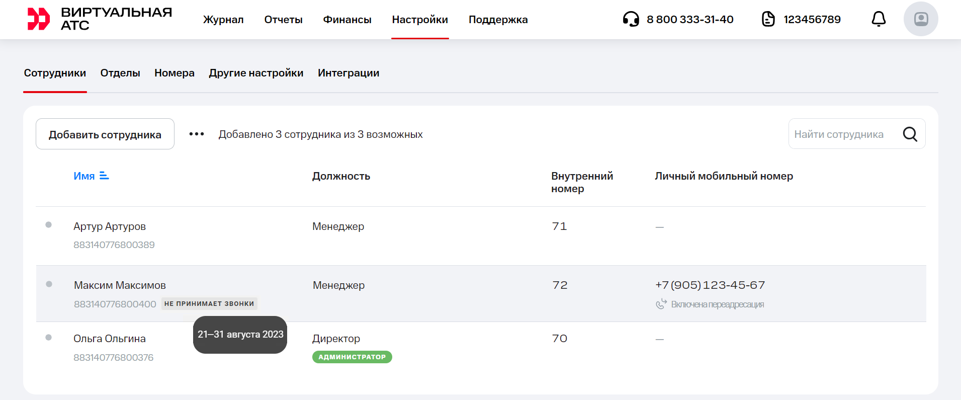 В период отсутствия менеджера на вкладке Сотрудники рядом с его именем появится серая плашка «Не принимает звонки». Чтобы узнать, когда менеджер вернется к работе, наведите курсор на эту плашку.