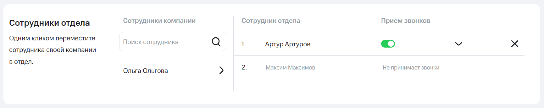Также посмотреть, какие сотрудники не принимают звонки, можно в настройках отдела.