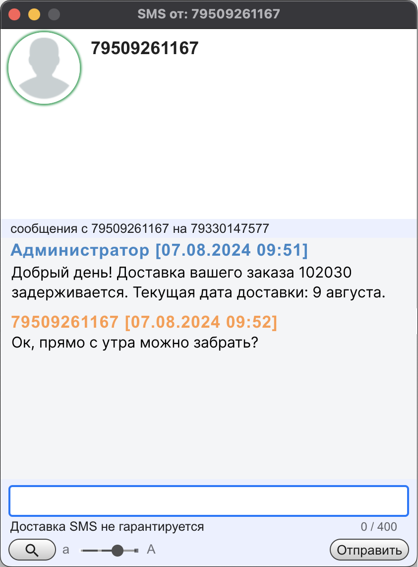 Администраторы ВАТС могут обмениваться SMS-сообщениями с клиентами через Коммуникатор. Это удобно, когда нужно подтвердить всю информацию по заказу, проинформировать клиента об изменениях в договоренностях, предложить персональную скидку и т.д.