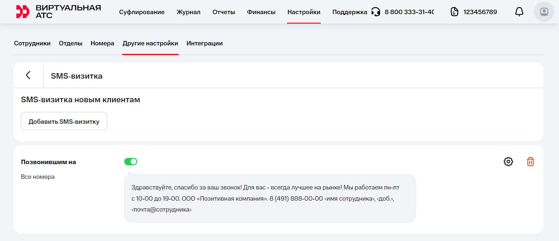 Для настройки зайдите в раздел «Настройки» - «Другие настройки» - «SMS-визитка».