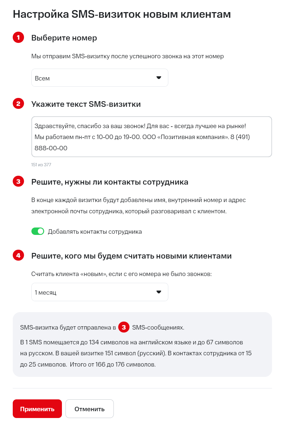 Настройте текст приветственной SMS. Также вы можете настроить, чтобы в SMS автоматически вставлялись контакты сотрудника, с которым говорил клиент (контакты берутся из данных о сотрудниках), настроить время, когда клиент считается новым, а также включить разные SMS-визитки для ваших номеров.