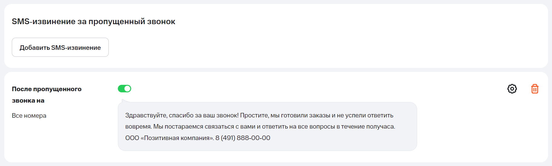 Клиент впервые звонит в вашу компанию и после разговора сразу же получает приветственное сообщение с контактами менеджера. Это позволит клиенту не потерять контакты вашей компании.