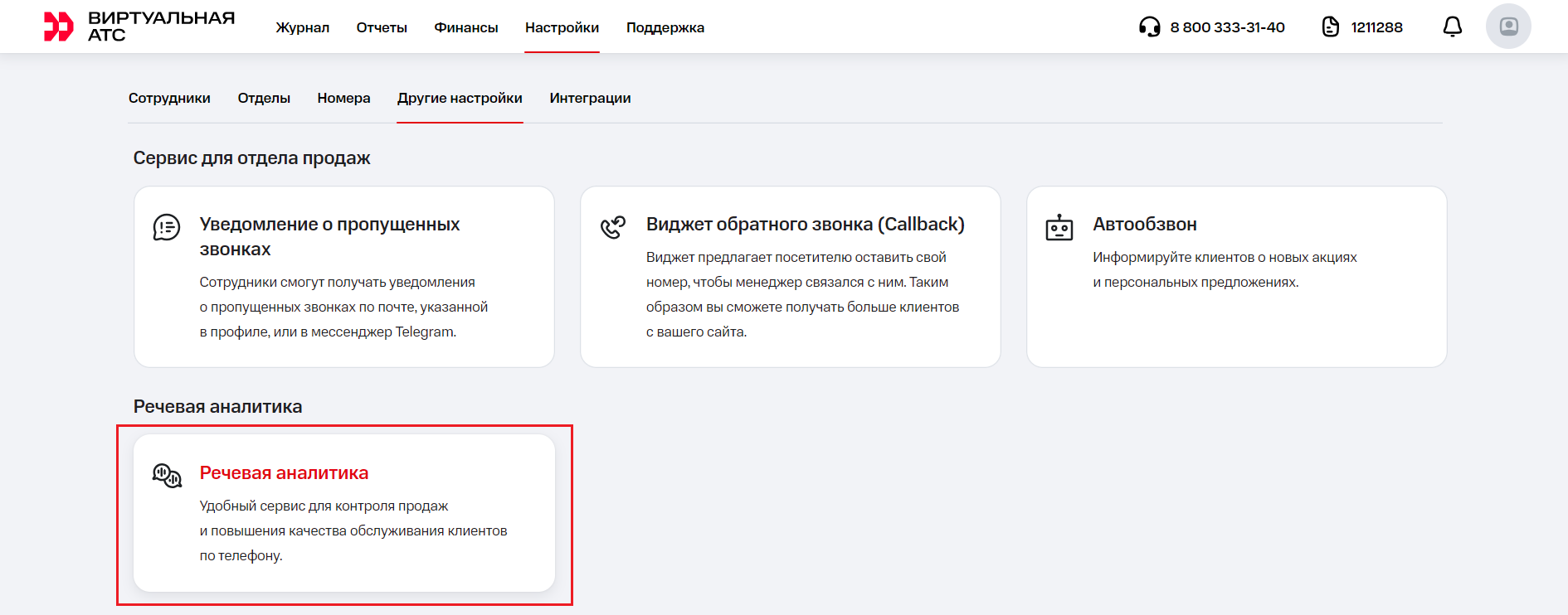 1. В личном кабинете АТС перейдите в раздел «Настройки» – «Другие настройки» и найдите виджет «Речевая аналитика». Кликните по нему.