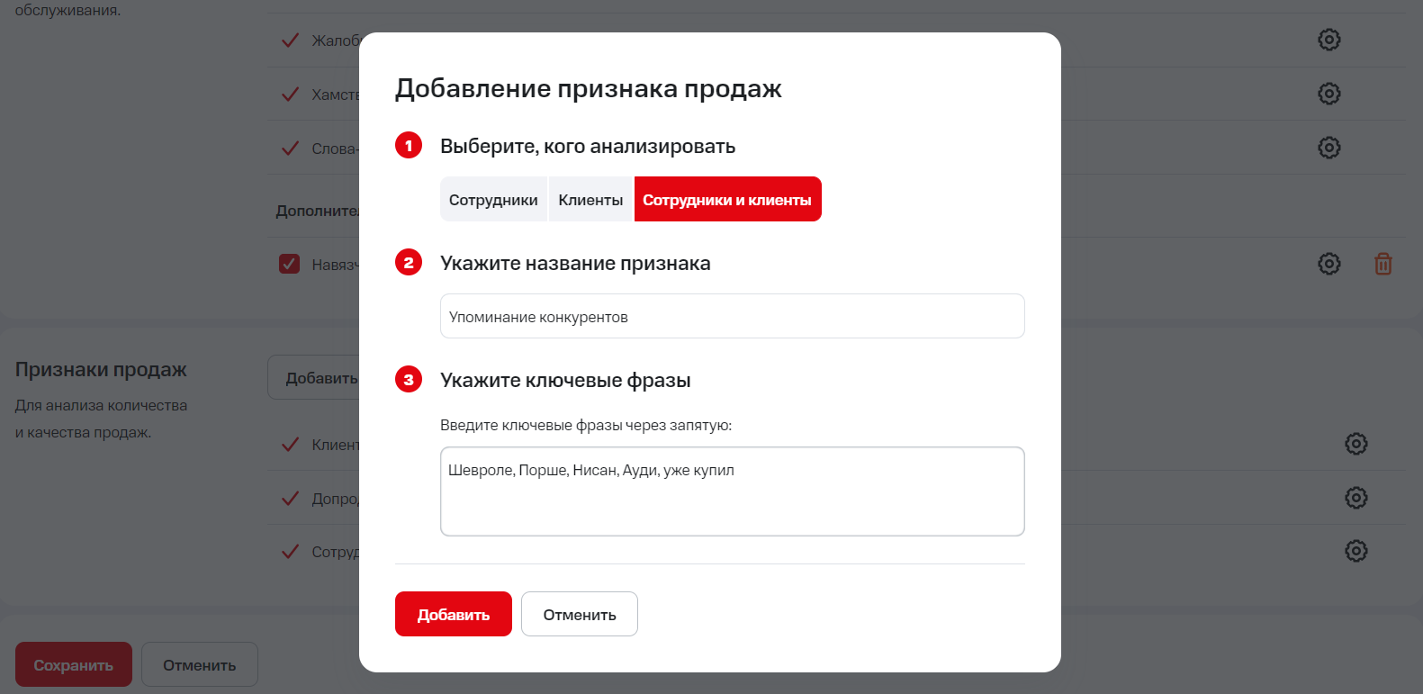 3. Вы также можете добавить любой другой критерий, который Виртуальная АТС будет отслеживать в разговорах менеджеров с клиентами. Для этого нажмите кнопку «Добавить признак».