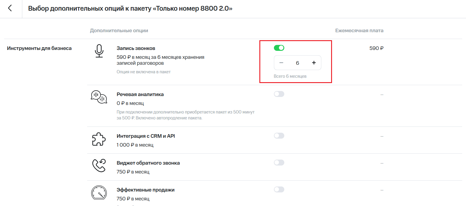 Если «Запись звонков» не подключена, включите опцию, передвинув переключатель вправо. Выберите сколько месяцев должны храниться записи звонков. Максимальный срок хранения – 36 месяцев.