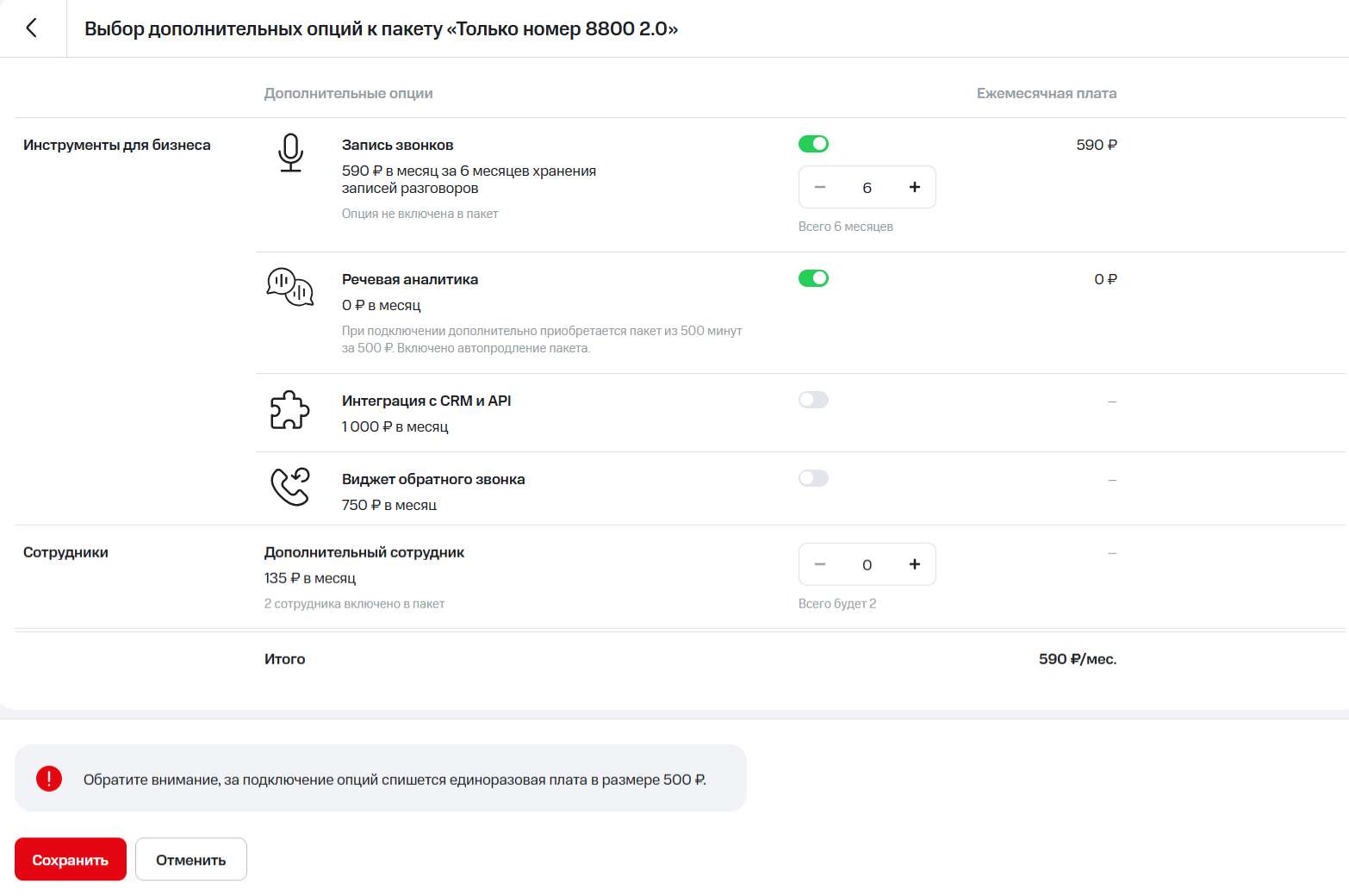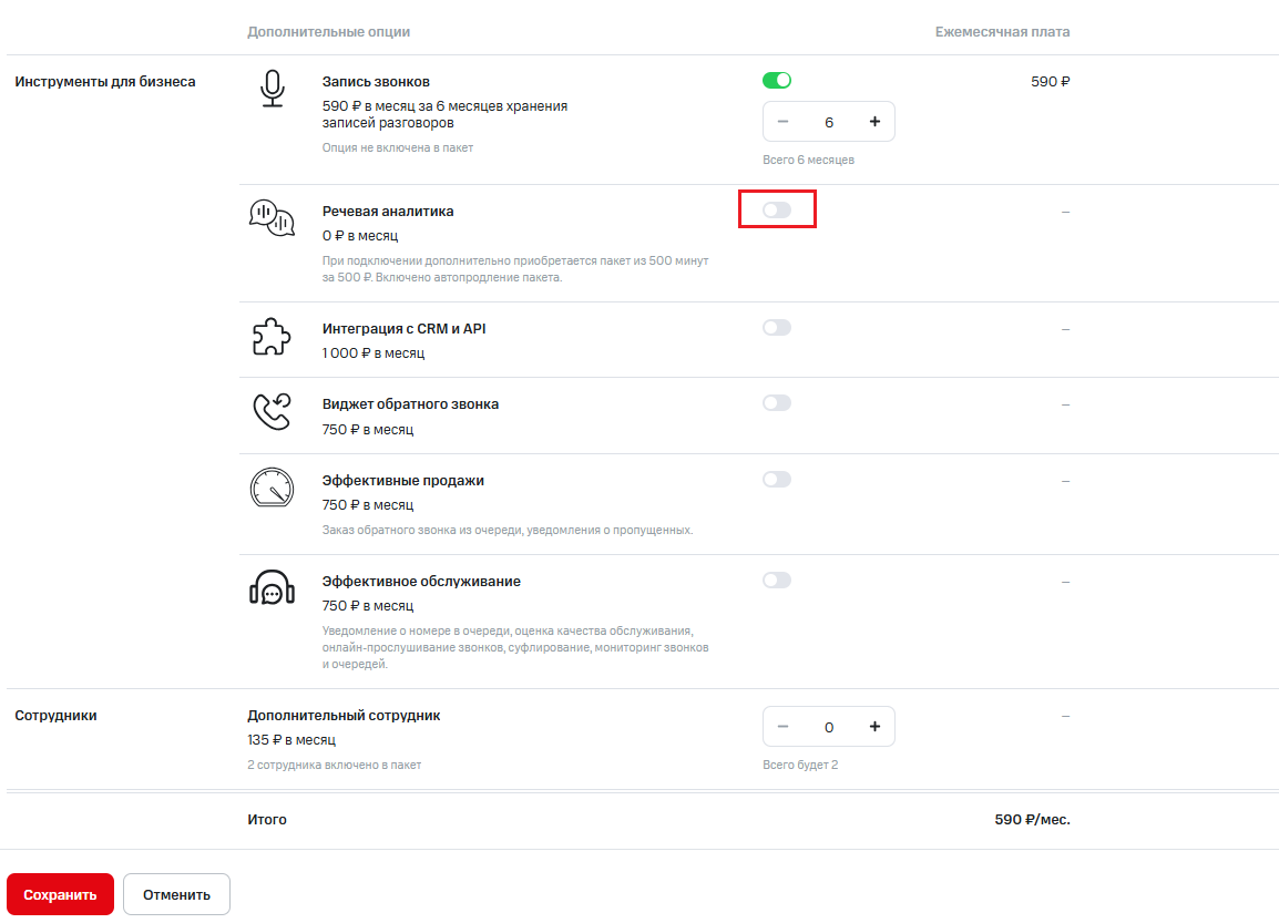 Стоимость опции отображается в столбце «Ежемесячная плата» в строке «Речевая аналитика». Сумма ежемесячного платежа за все подключенные опции — в строке «Итого».