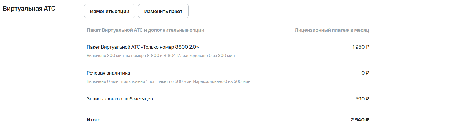 Подключенные опции «Речевая аналитика» и «Запись звонков» появятся на странице «Финансы» — «Управление пакетом» в разделе «Виртуальная АТС».