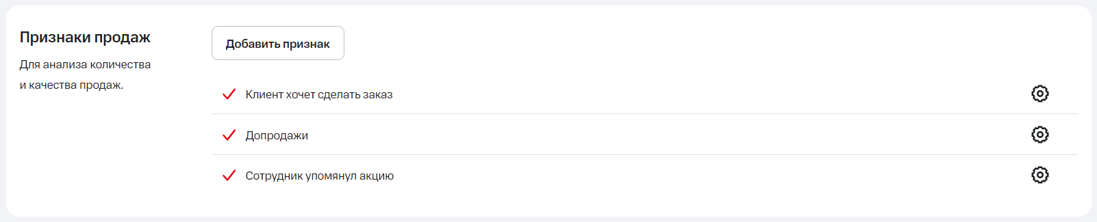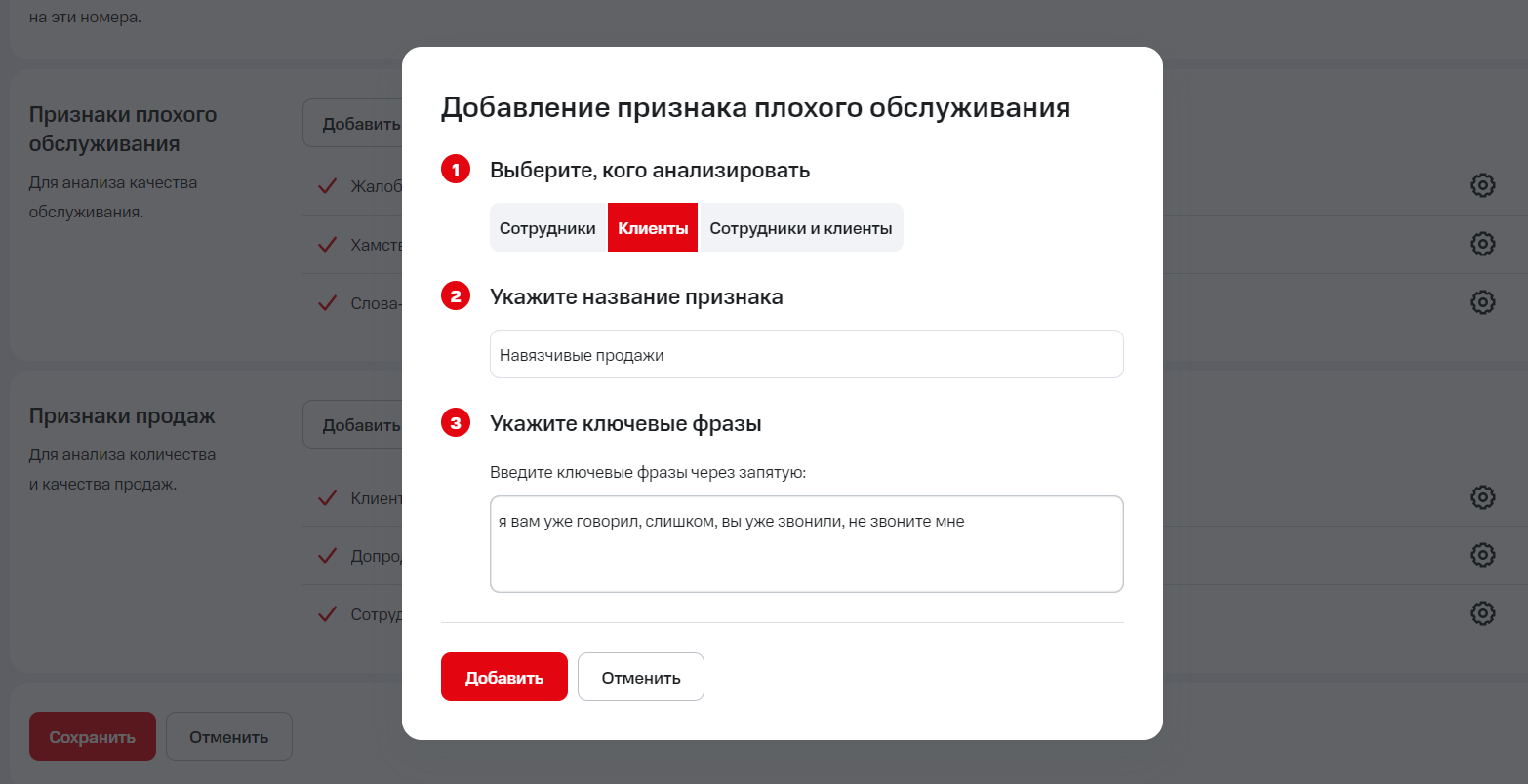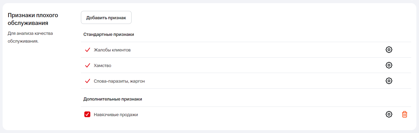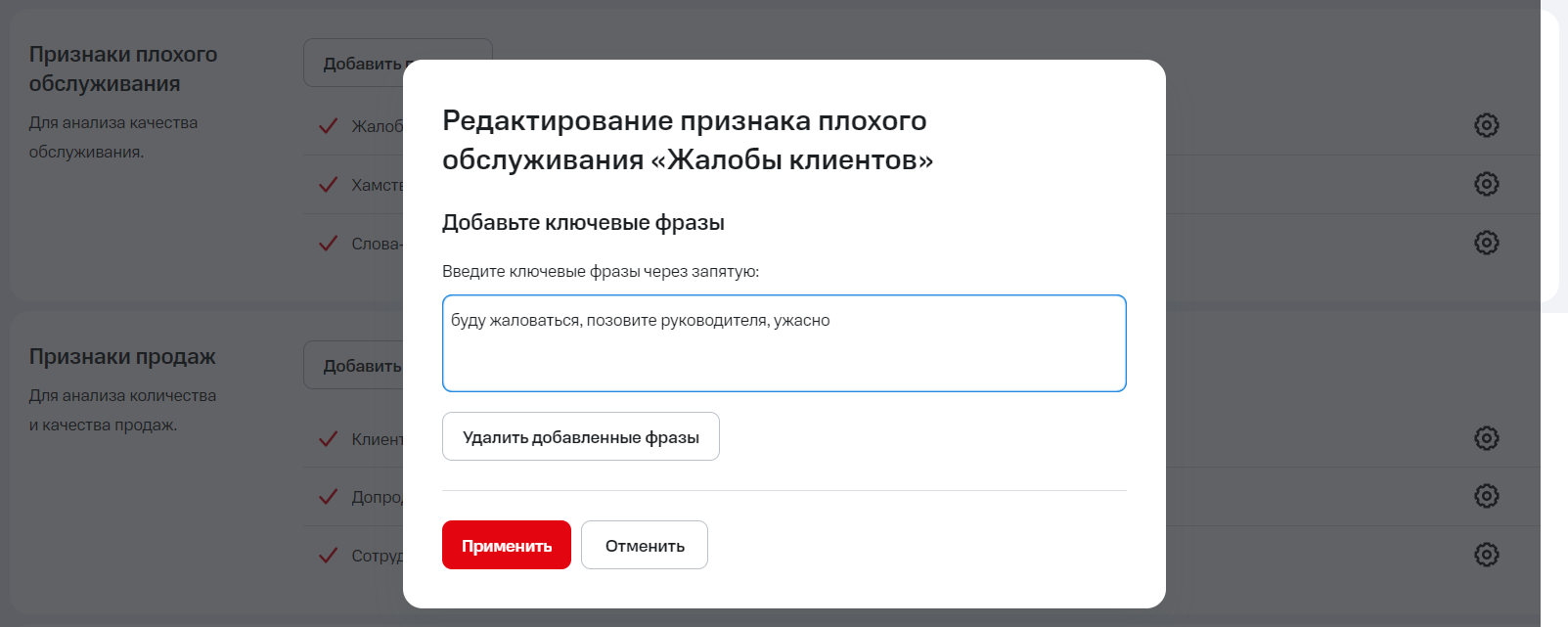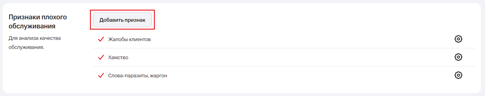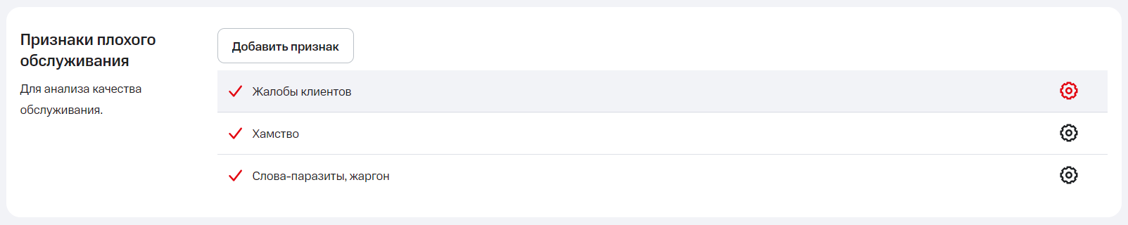 Вы можете использовать их либо добавить свои слова и фразы, которые встречались при плохом обслуживании в разговорах у ваших менеджеров. Чтобы добавить или отредактировать список, кликните на «шестеренку» напротив нужного признака.