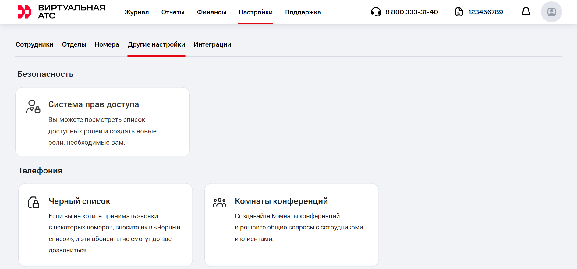 Чтобы посмотреть возможности ролей или изменить их, в настройках АТС перейдите на вкладку «Другие настройки». В разделе «Безопасность» кликните на блок «Система прав доступа».