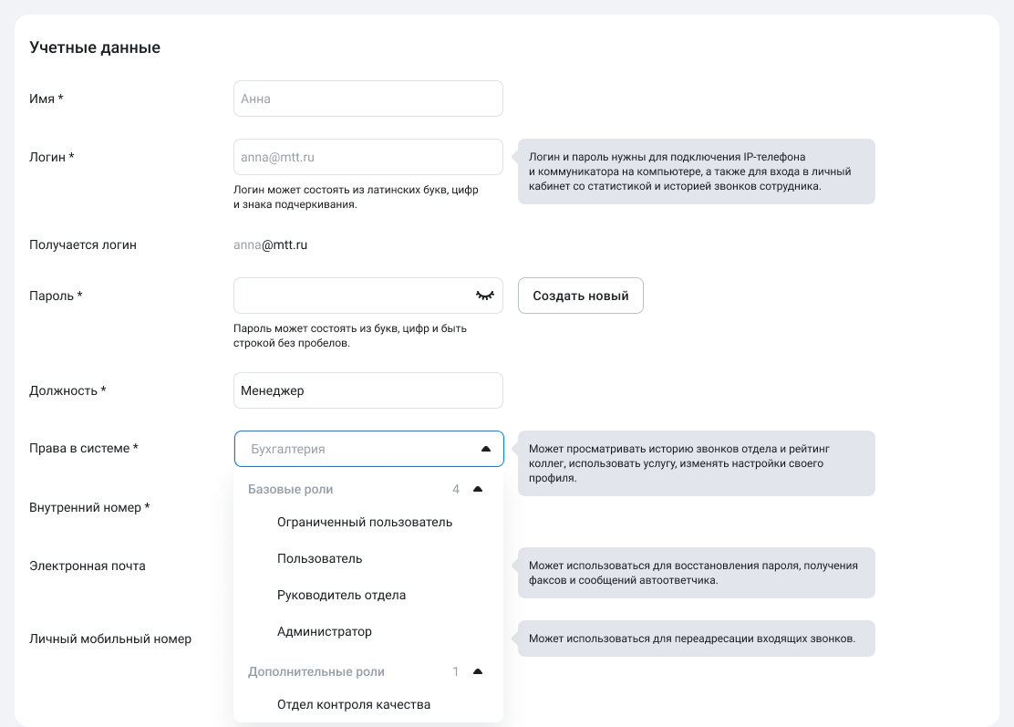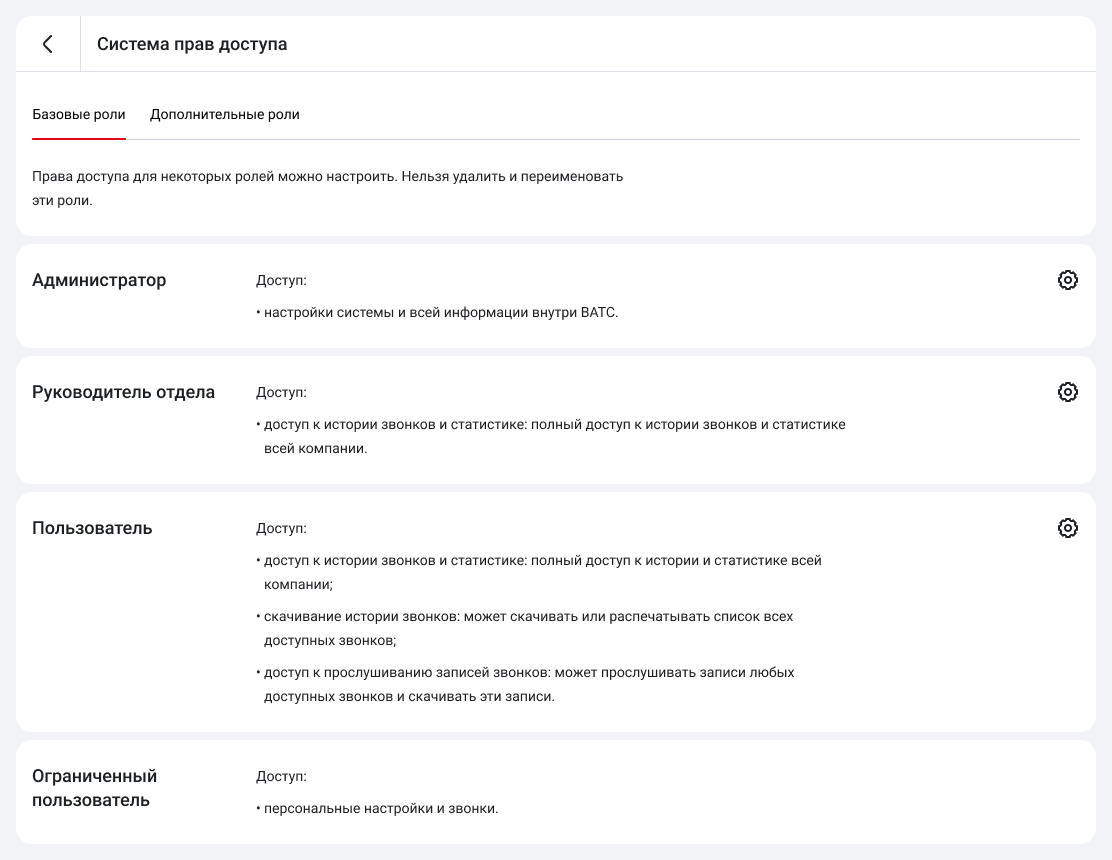 Каждая компания может сама решать, какие права доступа предоставлять рядовым сотрудникам, руководителям отделов и администраторам АТС. По умолчанию в АТС есть 4 уровня доступа: администратор, руководитель отдела, пользователь и ограниченный пользователь. Также можно настроить дополнительные роли, которые лучше подойдут для вашей компании.