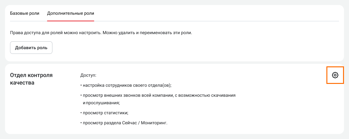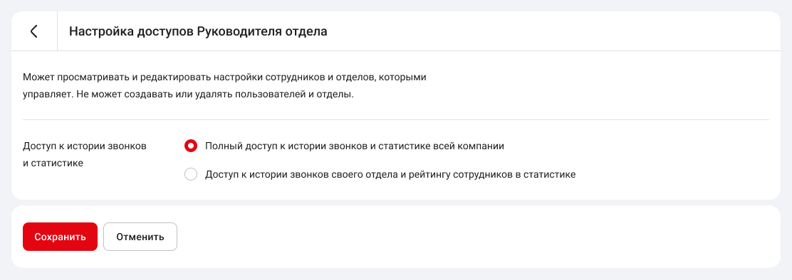 Также по умолчанию руководитель отдела имеет доступ к истории и статистике звонков своего отдела. Если хотите дать руководителю отдела доступ к истории и статистике по всей компании, нажмите на шестеренку рядом с этой ролью.