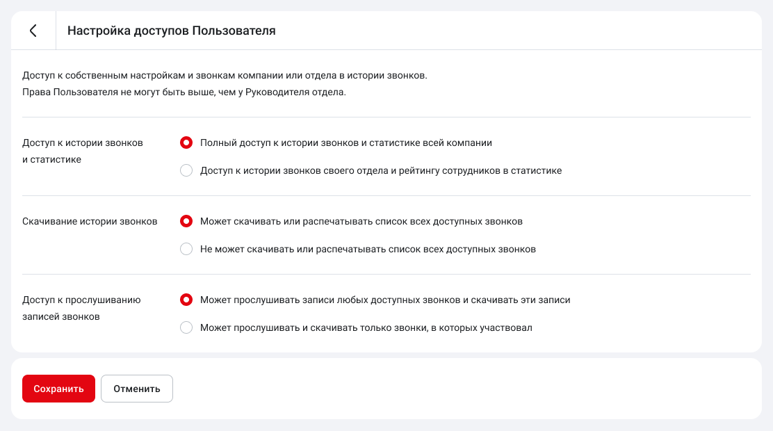 Доступ пользователя к истории звонков, статистике, скачиванию записей и их прослушиванию можно настроить по-разному. Чтобы изменить текущие настройки доступа, нажмите на шестеренку справа от роли «Пользователь».