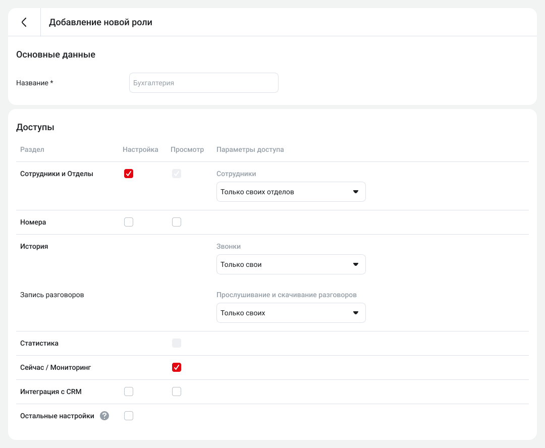 Выберите параметры для доступа к просмотру истории звонков и статистике (полный или только своего отдела), скачиванию истории (разрешить или запретить) и прослушиванию записей (все звонки или только свои).