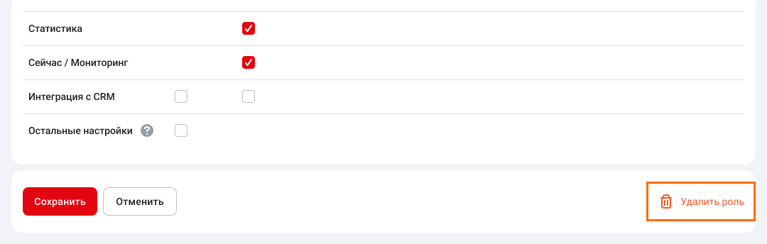 • Интеграция с CRM — можно настроить доступ для просмотра или редактирования настроек интеграций CRM.