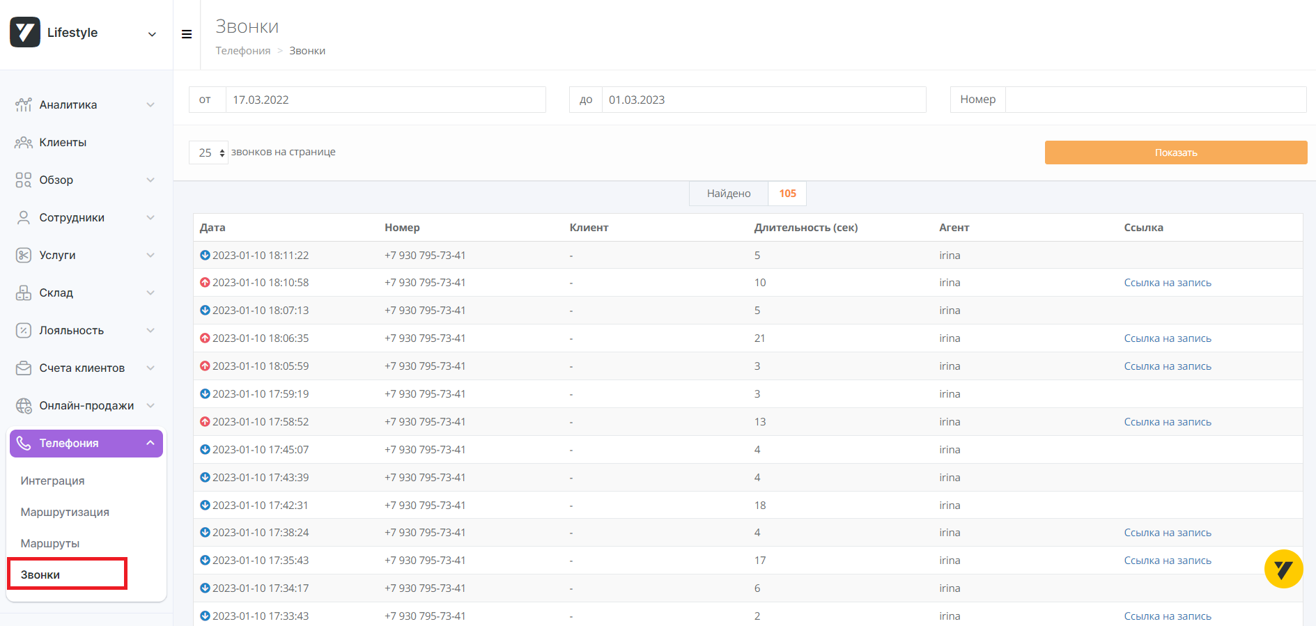 Вы попадете на новую страницу, где в таблице будут представлены даты звонков, их длительность, а также – ссылка на запись разговора.