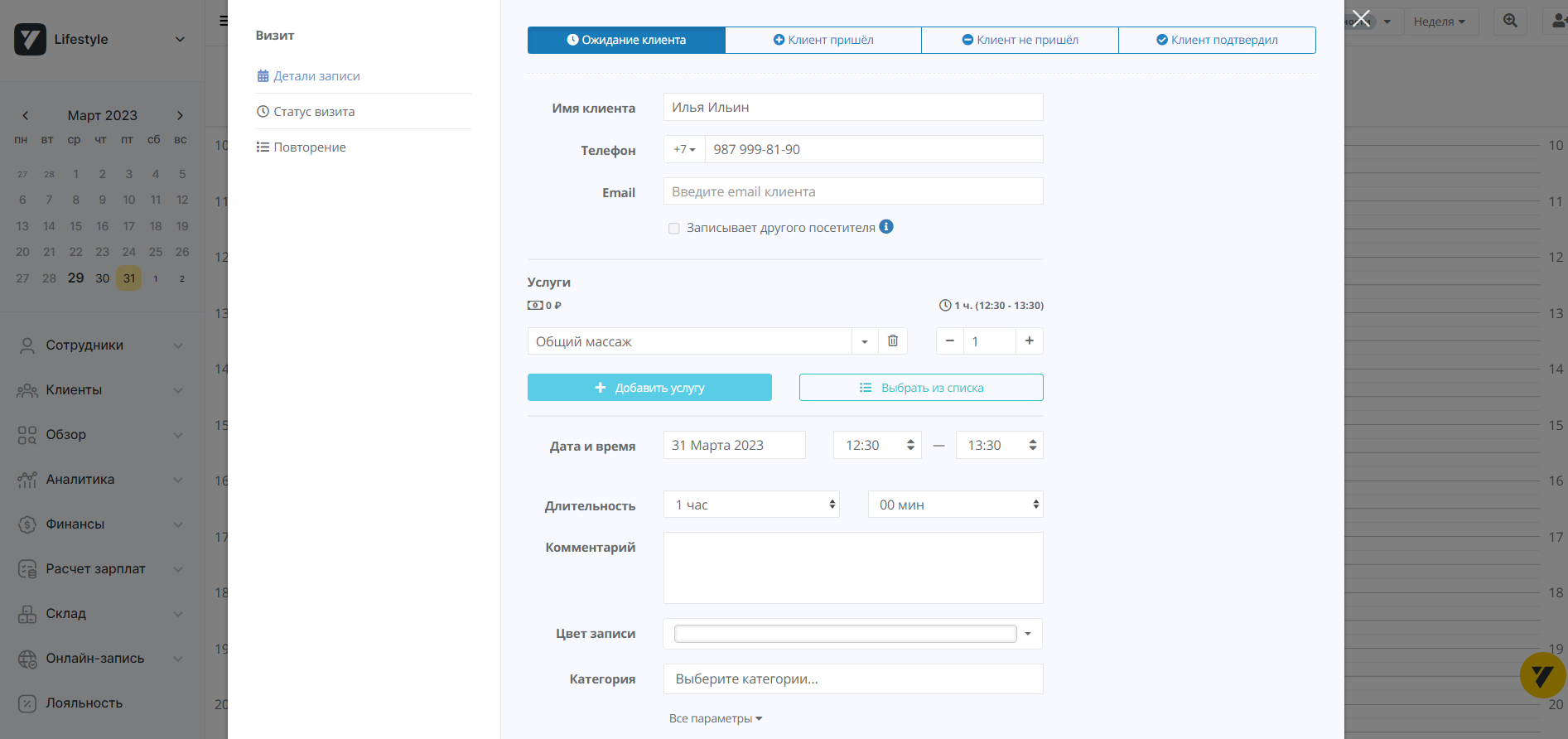 Записать клиента на конкретную дату (сеанс массажа, посещение мастера, тренировка и т. д.). В карточке вы сразу сможете отметить контактные данные звонящего, вид услуги, длительность и т. д. Запись будет сохранена в календаре.