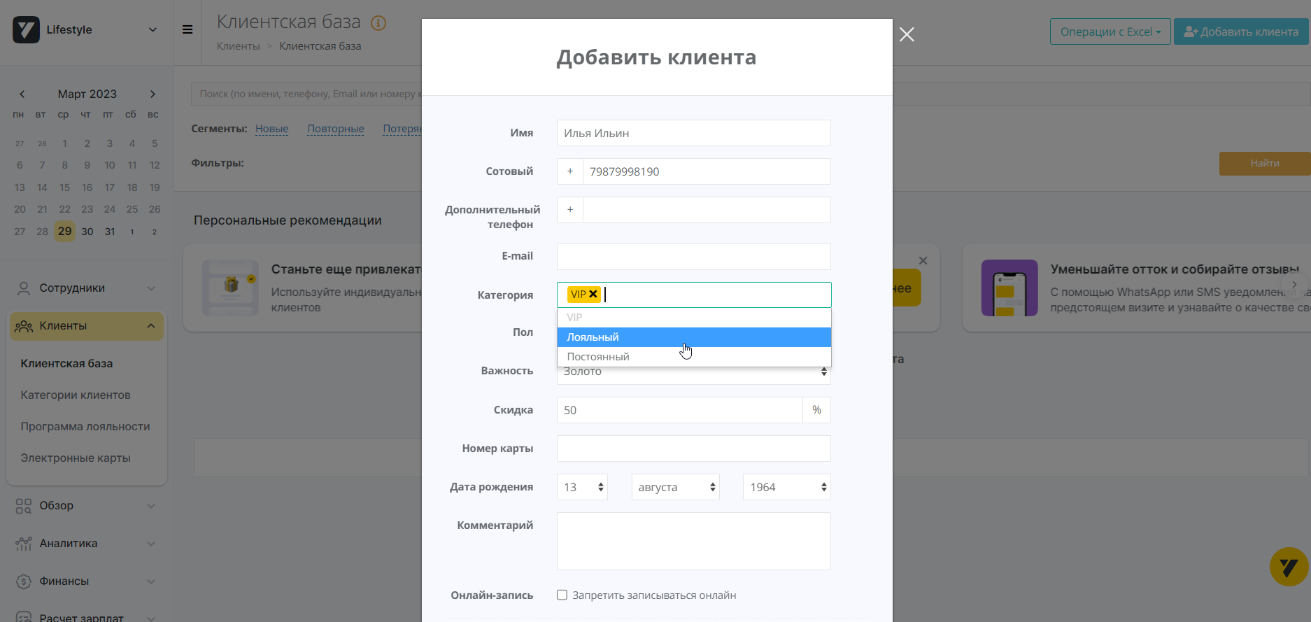 Добавить клиента в базу. При заполнении персональной карточки вы можете указать, помимо прочего, категорию звонящего (VIP, Лояльный, Постоянный) и его важность (Бронза, Серебро, Золото) и т. д. Контакт будет сохранен в разделе «Клиенты».