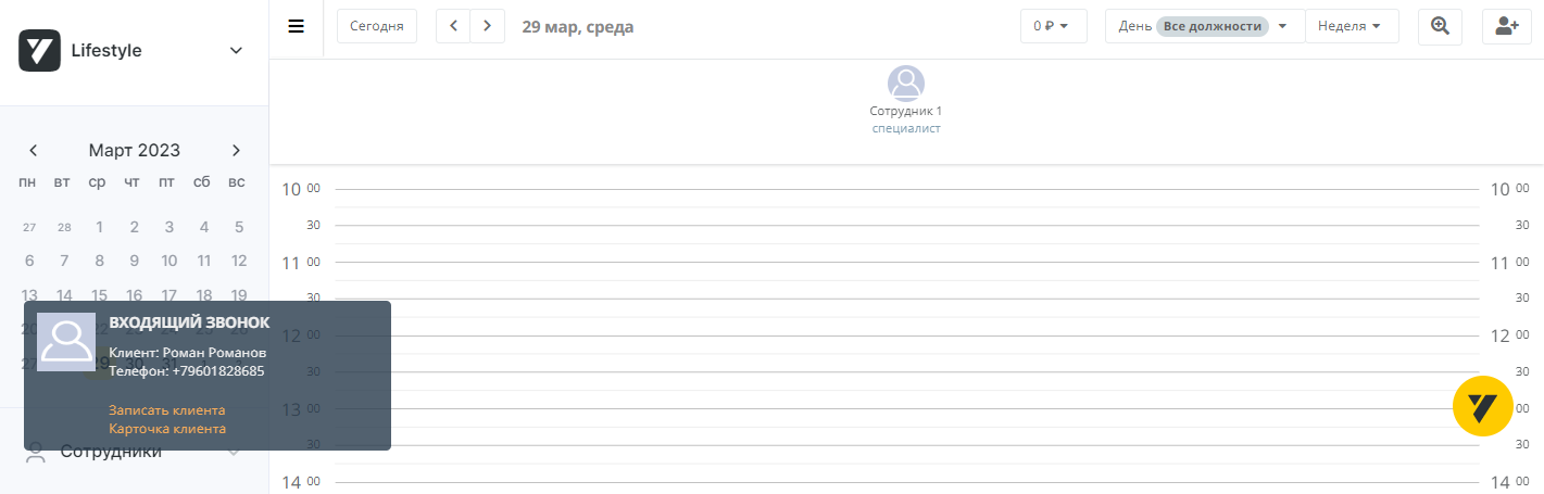 При входящем звонке клиента с неизвестного номера вы увидите в левом нижнем углу всплывающее окно с номером телефона, возможностью создать контакт или записать на прием на конкретное время.
