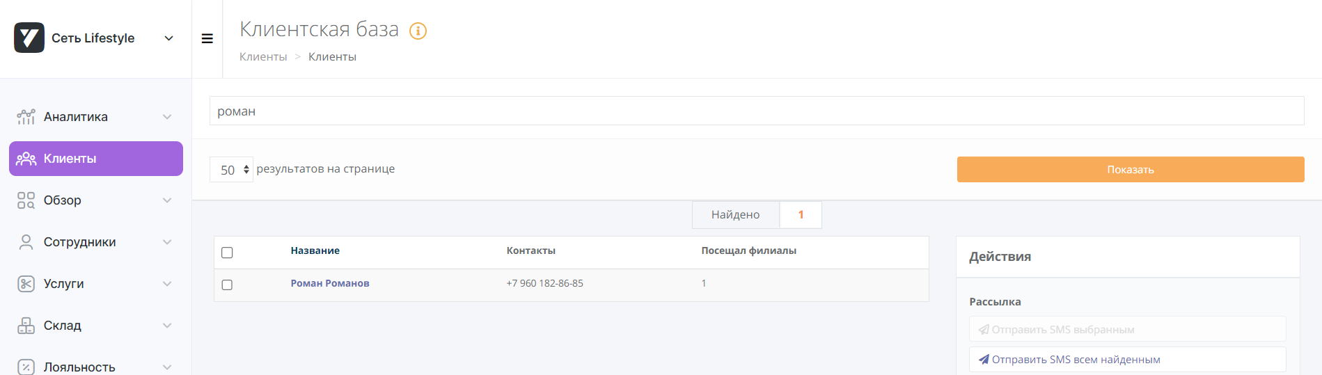 1. Если вас интересует конкретный клиент, выберите нужную «Сеть» и перейдите в раздел «Клиенты». В поисковой строке введите имя или фамилию. Нажмите на кнопку «Показать».