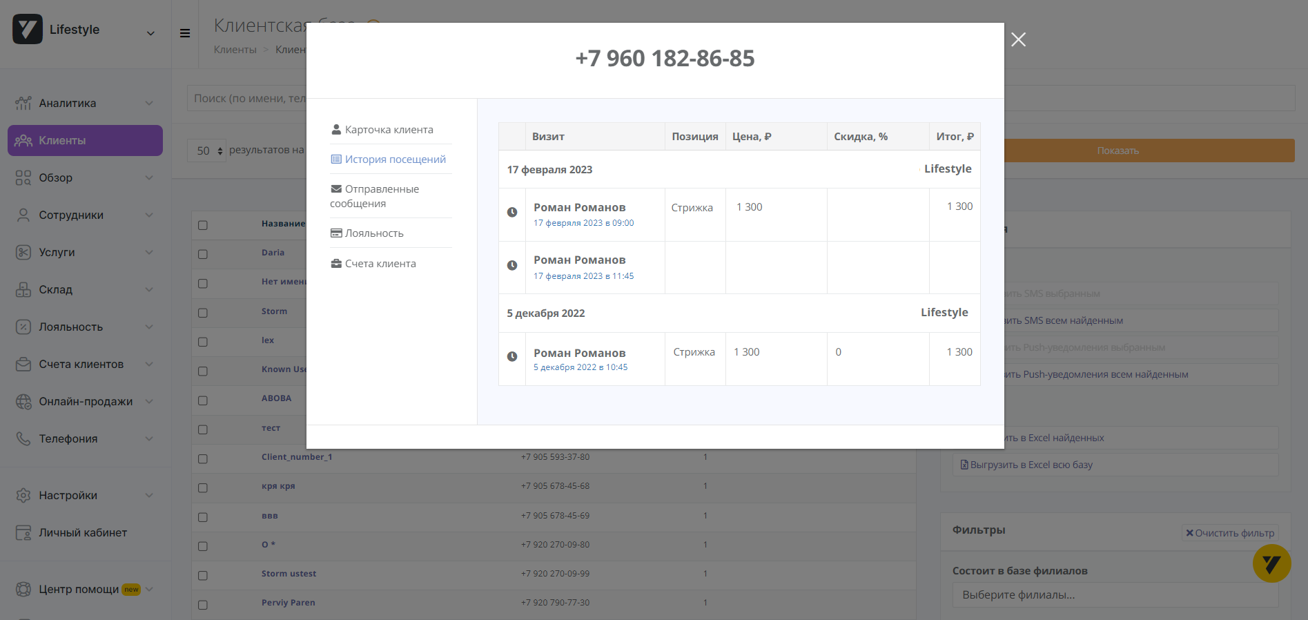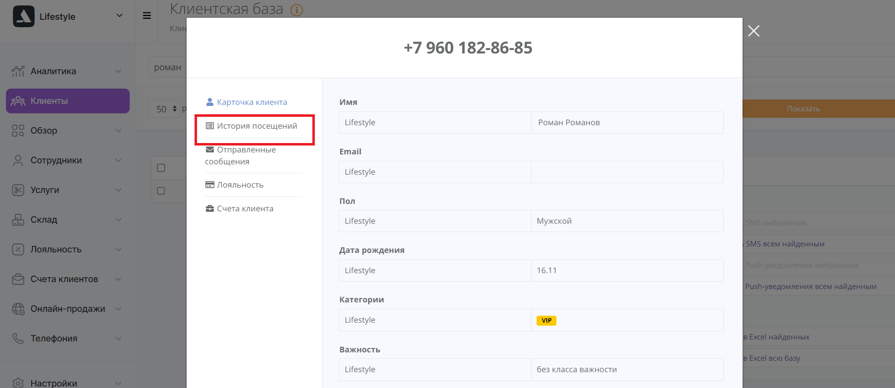 Кликните на имя в таблице. Вы попадете в персональную карточку клиента. Выберите «История посещений».