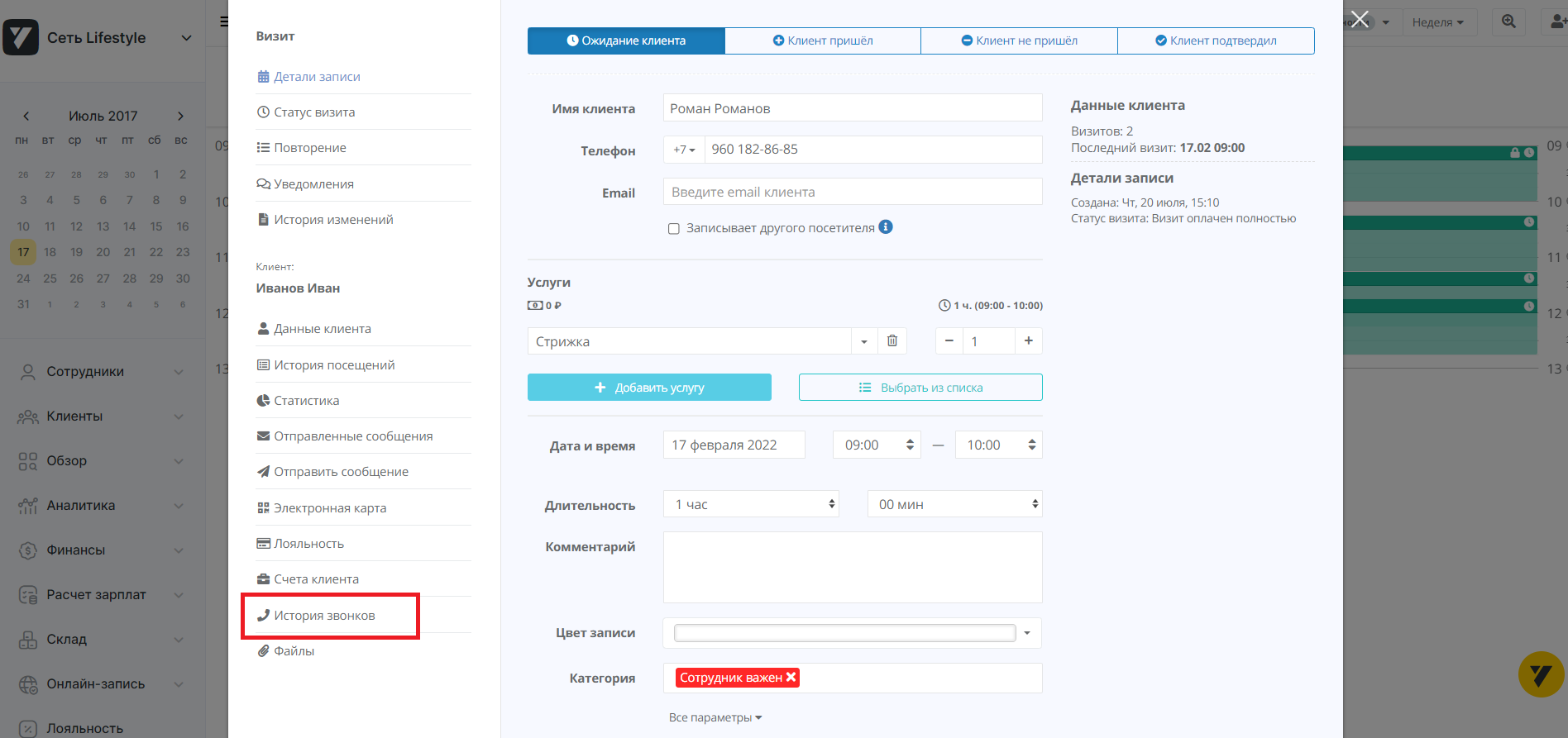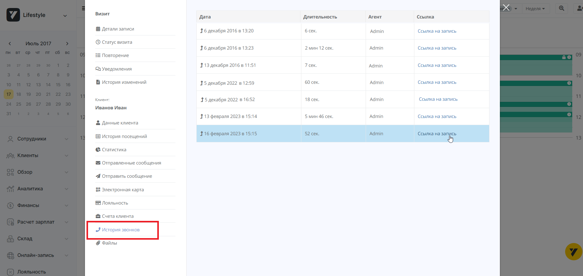 Выбрав интересующую дату, вы попадете на карточку детальной записи визита, сохраненную в календаре. В меню слева перейдите в «Историю звонков».