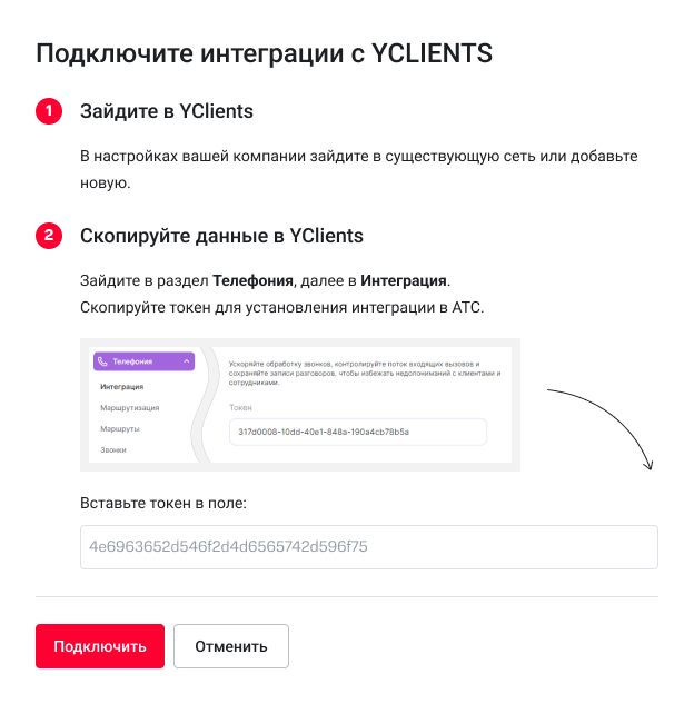 3. В открывшемся окне вставьте скопированный токен в соответствующее поле. Нажмите «Подключить».
